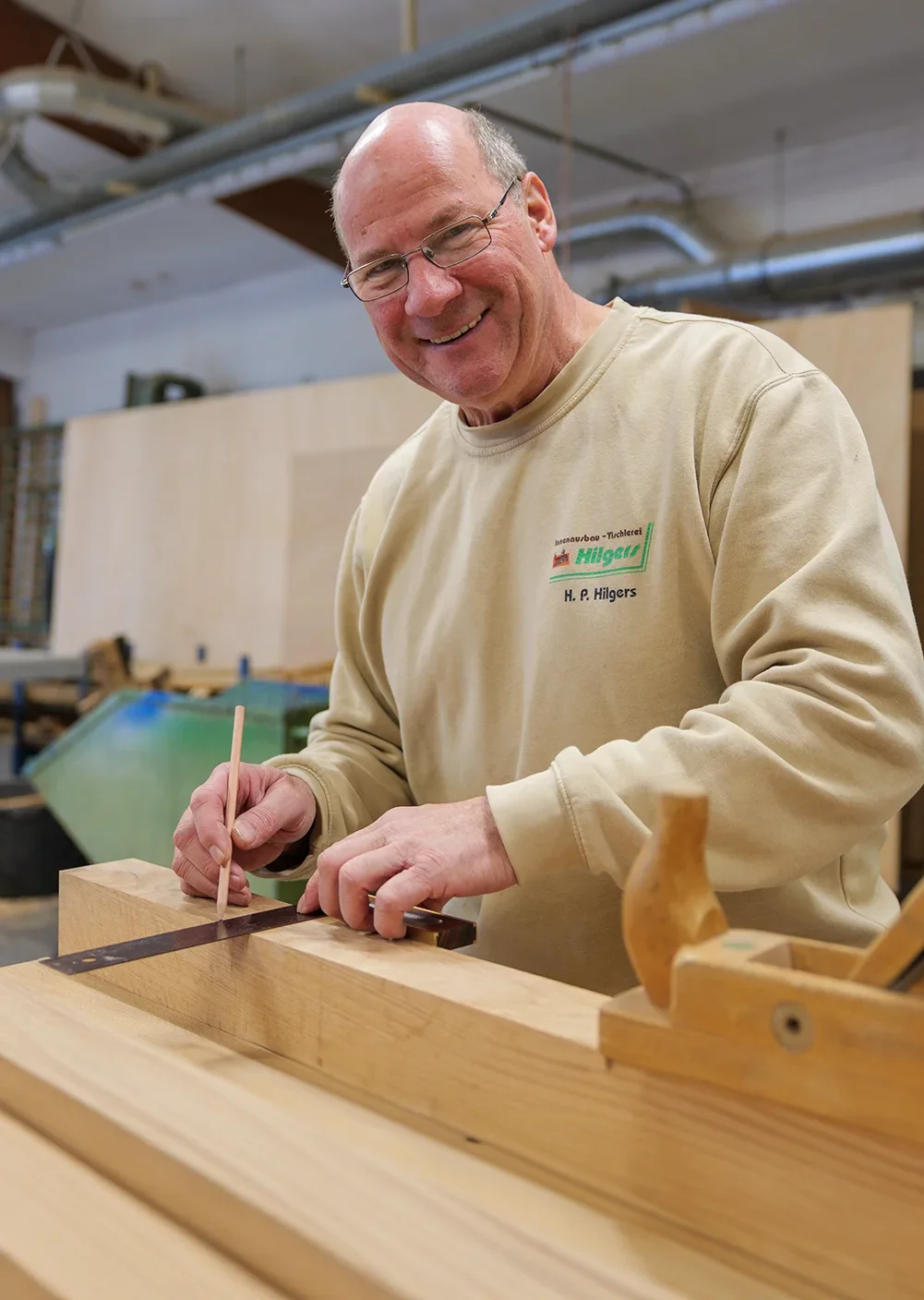 Unser eingespieltes Tischlerei-Team vereint jahrelange Erfahrung und technisches Know-how. Es besteht aus vier Mitarbeitern, darunter Tischlermeister Hans-Peter Hilgers, der schon seit seiner Jugend im Familienbetrieb tätig ist und die Tischlerei seit 1988 leitet, sowie drei Gesellen. Durch die zusätzliche Ausbildung eines Gesellen zum Ingenieur profitiert das Team zudem von wertvollem Fachwissen in Konstruktion und Planung.