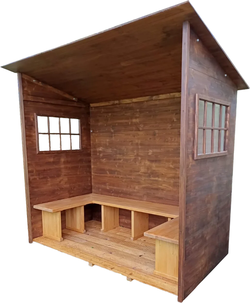 Die Hilgers-Holzhütte ist eine aus regionalem Holz gefertigte Hütte. Sie eignet sich ideal als überdachter Pausenplatz, Raucherunterstand oder gemütlicher Aufenthaltsbereich. Dank der robusten Bauweise und wetterbeständigen Materialien ist sie vielseitig einsetzbar, zum Beispiel für Unternehmen, Gastronomie oder den privaten Außenbereich.